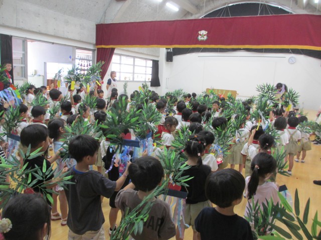 子どもたちの作った七夕飾りを持って、リズム室で七夕会が行われました