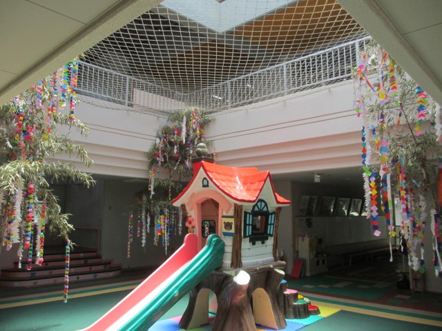 中庭には、学年ごとの七夕飾りを付けた笹竹が飾られています